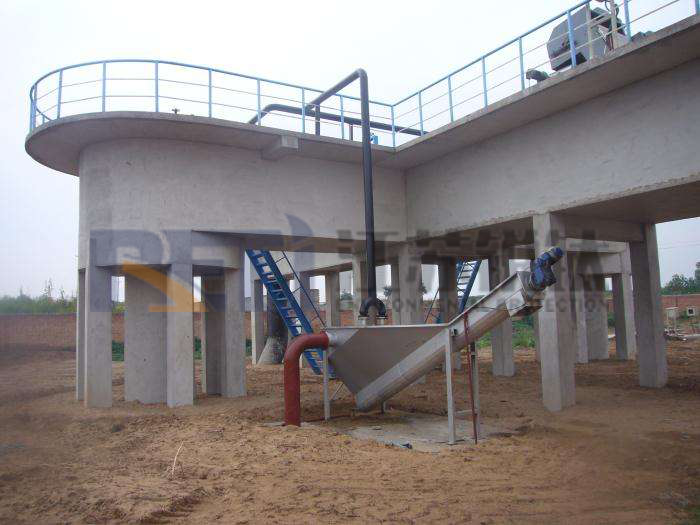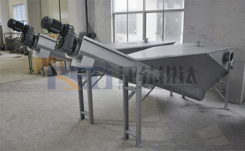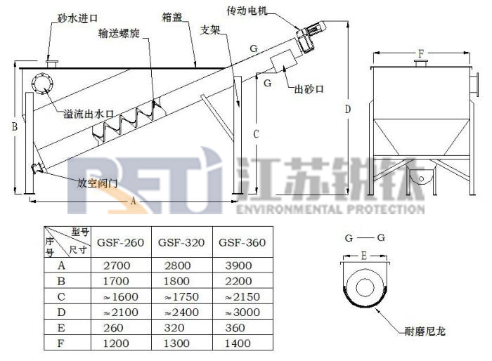 RT‐GSF无轴螺旋砂水分离器适用于污水处理厂(站)的沉砂池,是污水处理中用于处理砂水混合液的设备。工作原理 砂水分离器设备一般安装倾角在20°‐30°之间,砂水混合液从进水管进入本设备,混合液通过分离机上部的聚集器,在水流的作用下,使混合液中的砂粒与有机物进行分离,砂、水进入集砂槽中,比重较大的颗粒(如砂粒)由于自重而下降沉积于螺旋槽底部,在螺旋叶片的推动下,物料沿斜置的U型槽底部提升,离开液面后,继续上移一段距离,砂粒中的水分逐渐在螺旋槽和叶片的空隙中流回水箱,砂粒液逐渐干化到出料口处,依靠自重落入其它输送装置。上清液则不断的从排水堰溢出管道流出,有机物在水流漩涡的作用下,则从聚集器的上顶流出,通过管道回流至污水井中,从而达到砂水分离的目的。技术性能分离效率可达96%‐98%,可分离出粒径0.2mm的颗粒;采用无轴螺旋,无水中轴承,其结构设计保证物料流通,无堵塞,维护方便;减速器为先进的轴装式,不用联轴器,安装对中方便。盛水箱体具有足够的强度和刚度,采用连续焊接工艺,无渗漏现象。