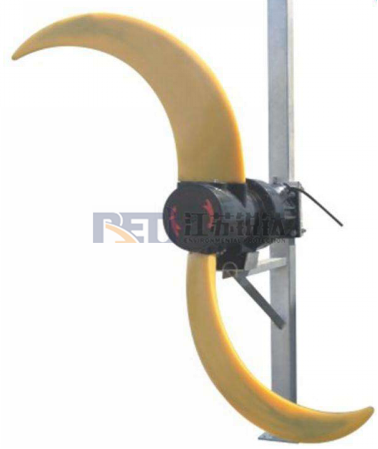 螺旋桨为二片式,采用高强度聚氨酯叶片,叶片宽度大,侧面薄,表面平滑,并且为后掠式,具有自洁功能确保了搅拌器的高效、无堵塞运行。该叶轮运用了螺旋桨推进原理和计算机工况模拟,其制造采用先进设计软件和加工中心制作整体式模具,并采用整体式成型,保证叶轮叶片的几何尺寸、叶面形状、伸展方向为零误差,叶片材料采用特种配方,使其柔韧性与刚性相宜,工作状态下,能根据局部液体介质浓度的不同,上下叶片受液体压力的不同以及引起动不平衡的各种因素,自然调适动态平衡消除冲击载荷,使传动平稳,运行可靠,寿命延长。