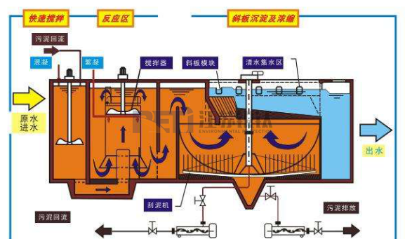 3.斜管(板)顶部以上清水区高度为1.0—1.5m,底部以下配水区高度不小于1.0—1.5m。机械排泥时,配水区高度应大于1.6m,便于安装和检修。