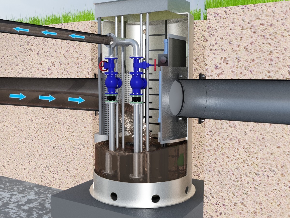 一体化智能截留井由箱体(材质为玻璃钢或金属)、排水闸门、截污闸门、潜污泵、雨量计、液位计、水质监控仪及SCADA控制系统等部件组成。通过感知仪器收集数据,上传云平台服务器,自动选择对应模式,控制排水闸门、截污闸门及水泵动作。真正做到"晴天污水不溢流,雨天减少雨水进入污水管网,远程联动,无人值守"。